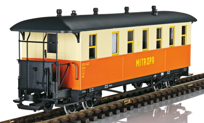 Der MITROPA-Speisewagen der Fichtelbergbahn der nie einer war! Zum Jubiläum der Strecke Cranzahl-Oberwiesental 1977 wurde der Wagen 970-543 in diesem auffälligen orange/elfenbein gestrichen. Die Farbgebung wurde in Anlehnung zum Salonwagen der Weißeritztalbahn 970-445 gewählt. Vielen ist diese Farbgebung allerdings eher von den "Städte-Express"-Zügen der DR bekannt. Der Wagen wurde entgegen seiner Beschriftung nie als Speisewagen genutz und auch seine Einrichtung hatte nichts mit einem Speisewagen zu tun, er war ein ganz normaler Sitzwagen. Nachdem der Wagen in den 80er-Jahren keine Betriebsfristen mehr hatte, wurde er abgestellt und rottete in einem immer schlechteren Zustand vor sich hin. 1991 wurde der Wagen zur Weißeritztalbahn überführt und zum Neubau-Gepäckwagen 974-503 umgebaut.
