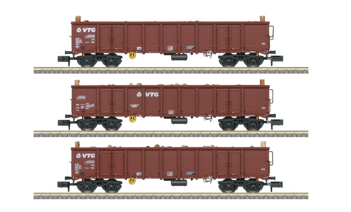 die von der VTG eingestellten offenen Güterwagen der Bauart Eanos sind mit Rundholz beladen.